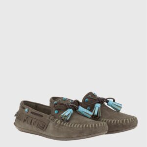 Mocasines de ante con costuras en contraste lazo y borlas de colores. tachuelas decorativas forro y plantilla de piel. un estilo boho chic, cómodo y original.